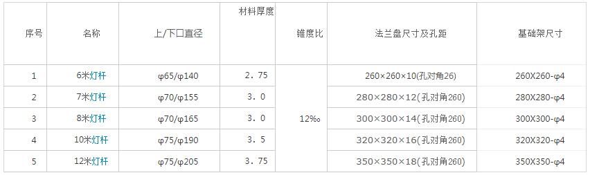 一、標(biāo)準(zhǔn)燈桿尺寸參數(shù)表